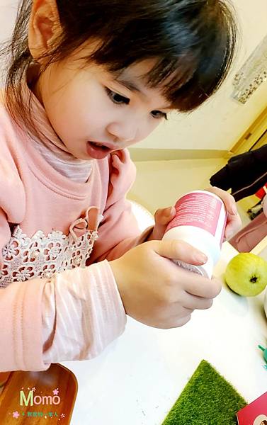 一開箱就看到兩盒顏色亮眼的粉紅色盒子,Momo一看到是粉紅色外盒,馬上黏到我身上,興奮的問我“這是什麼?這是什麼?”