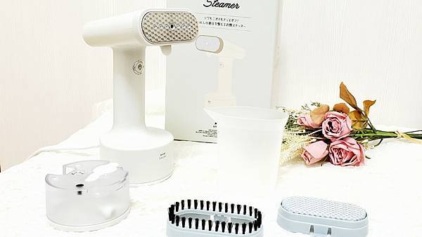 開箱就會看到一台蒸氣熨斗、水杯、噴頭蓋、毛刷套、說明書。(水箱已經套在熨斗上)