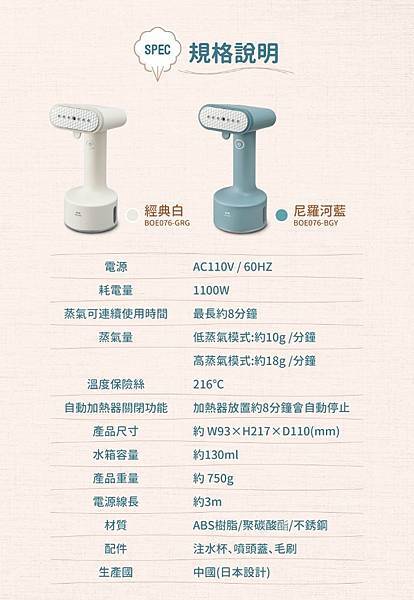 🔻【BRUNO手持Turbo加壓蒸氣熨斗】有著復古風格的外型,顏色有經典白、尼羅河藍。附上規格表讓大家了解。