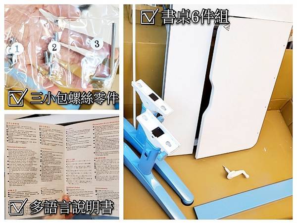 書桌這箱的零件簡單扼要,一個桌板、一組桌腳、一個活動軸、一個橫桿、調整書桌高度把手,總共6件,加上只要八顆螺絲就能搞定