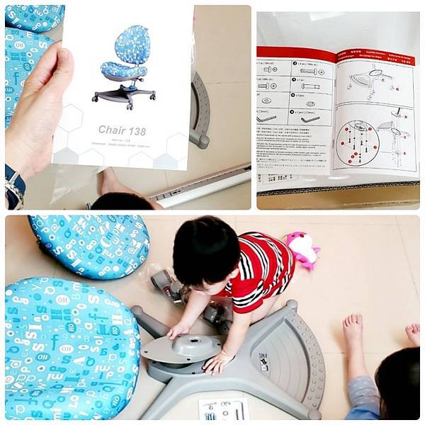 瀏覽一下說明書,欣美Singbee138卓越成長椅,只要5步驟就能完成,簡單到連小對對都想摻一腳幫忙了,不過組裝椅子雖然看似輕鬆,不過還是要注意小寶貝的安全唷!