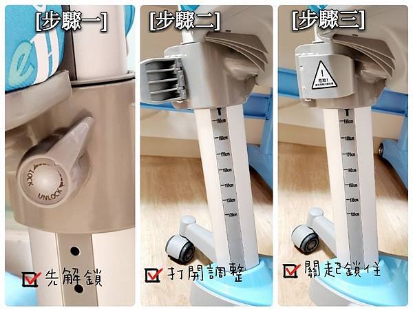 我們可以依照孩子的身高調整椅子的高度,調整三步驟: