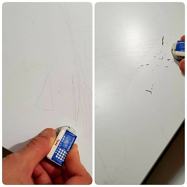 Singbee欣美新酷炫L桌桌面潔白乾淨的樣子真的很舒服,不過人家說白色不耐髒,還好桌面使用抗汚美耐板,鉛筆痕跡使用橡皮擦擦拭就能搞定,彩色筆、奇異筆也可以使用酒精或其他清潔劑處理。美耐板材質不容易刮傷,桌面也就不會花花的