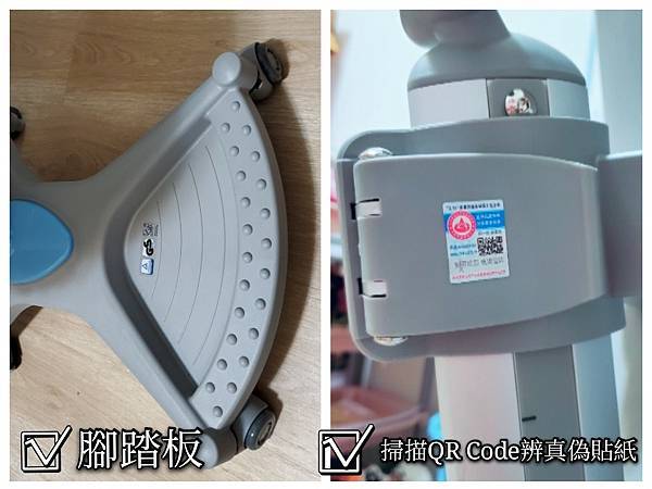 底部設計踏板,Momo的腳踩踏板,就不會想要晃腿了。每張椅子都有防偽ORcode,可以掃描辨別真偽喔。