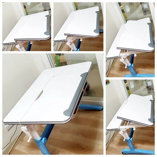 桌面5段式調整033度傾斜,依照孩子的需求調整,像是Momo平常寫作業,我就會使用第一段,玩拼圖就用第二段,她喜歡畫畫,調到第三段是最適合哦。想要回復為平坦桌面,調到第五段再往上拉抬,就能回復。氣壓式緩衝設計,桌板能輕輕慢慢地降下,不夾手非常安全!!