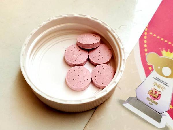 每一顆口嚼錠呈現粉紅色,仔細看裡面還有一點一點山桑子粉末顆粒呢,錠狀顆粒小,所以寶貝在吃的時候,可直接咬碎或含著,若不小心吞下去比較不擔心噎到的問題!